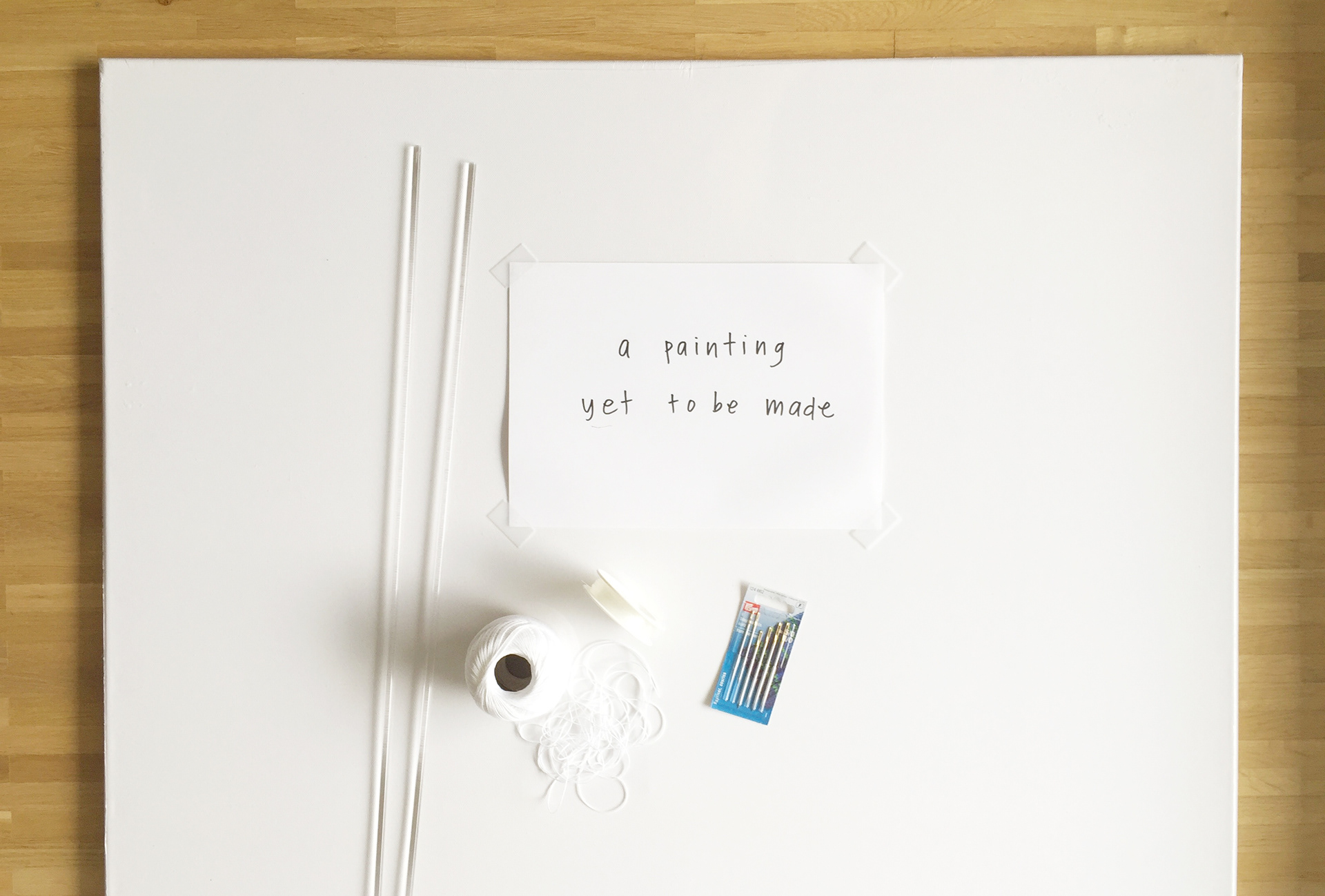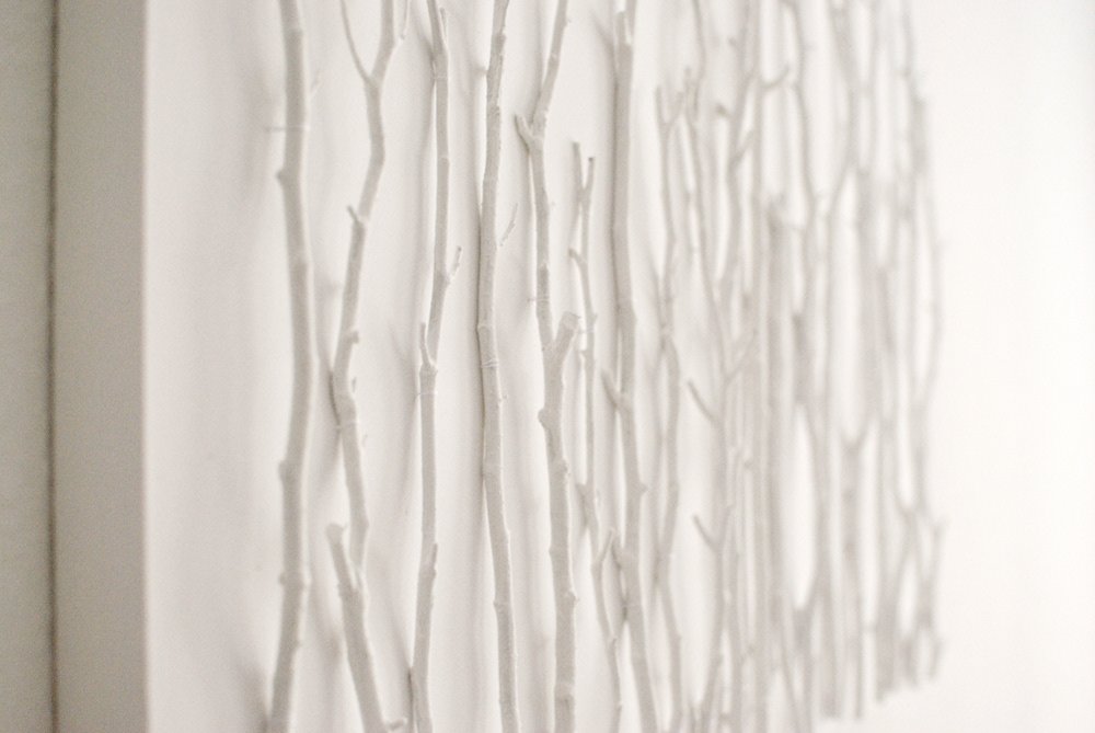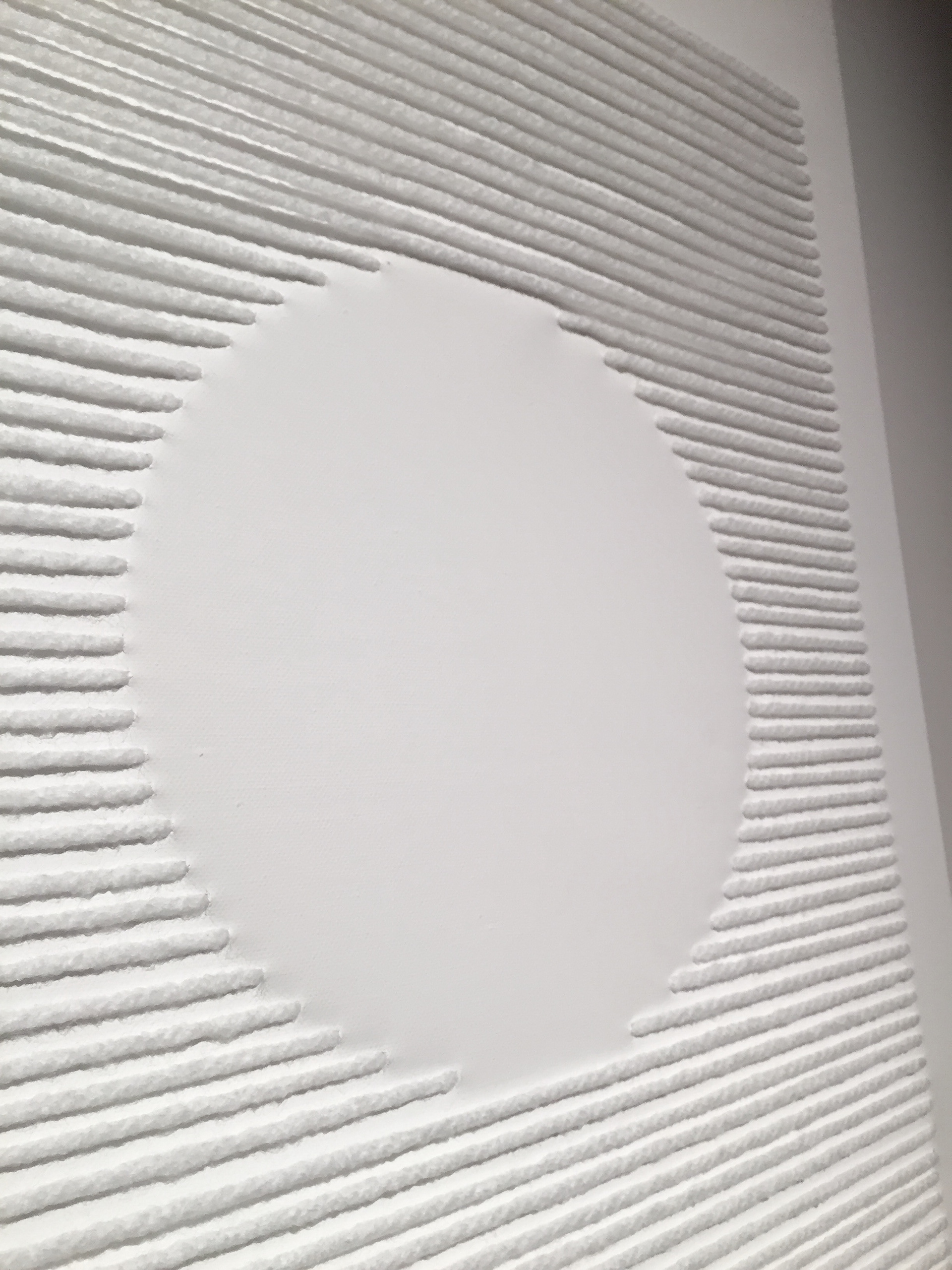 A series of white-on-white artworks using mixed media on plain canvases. The pieces incorporate material textures and shapes to create whimsical gradients of white.