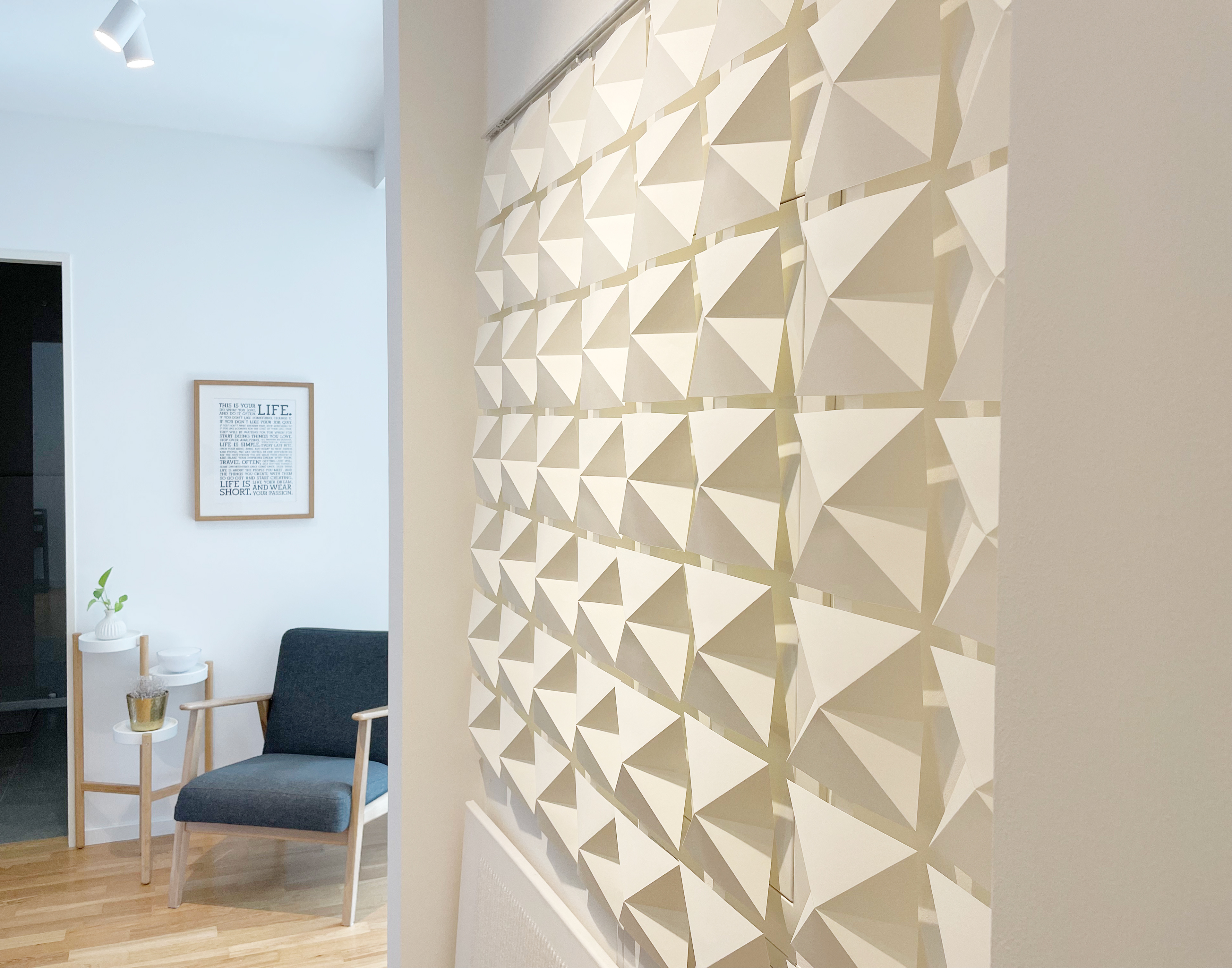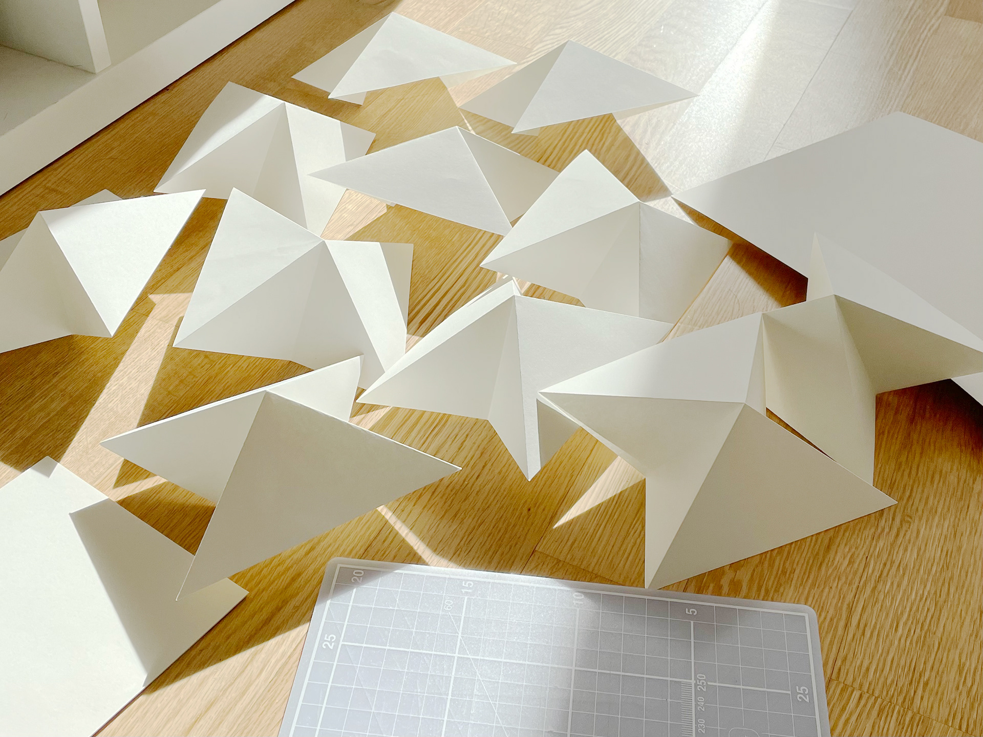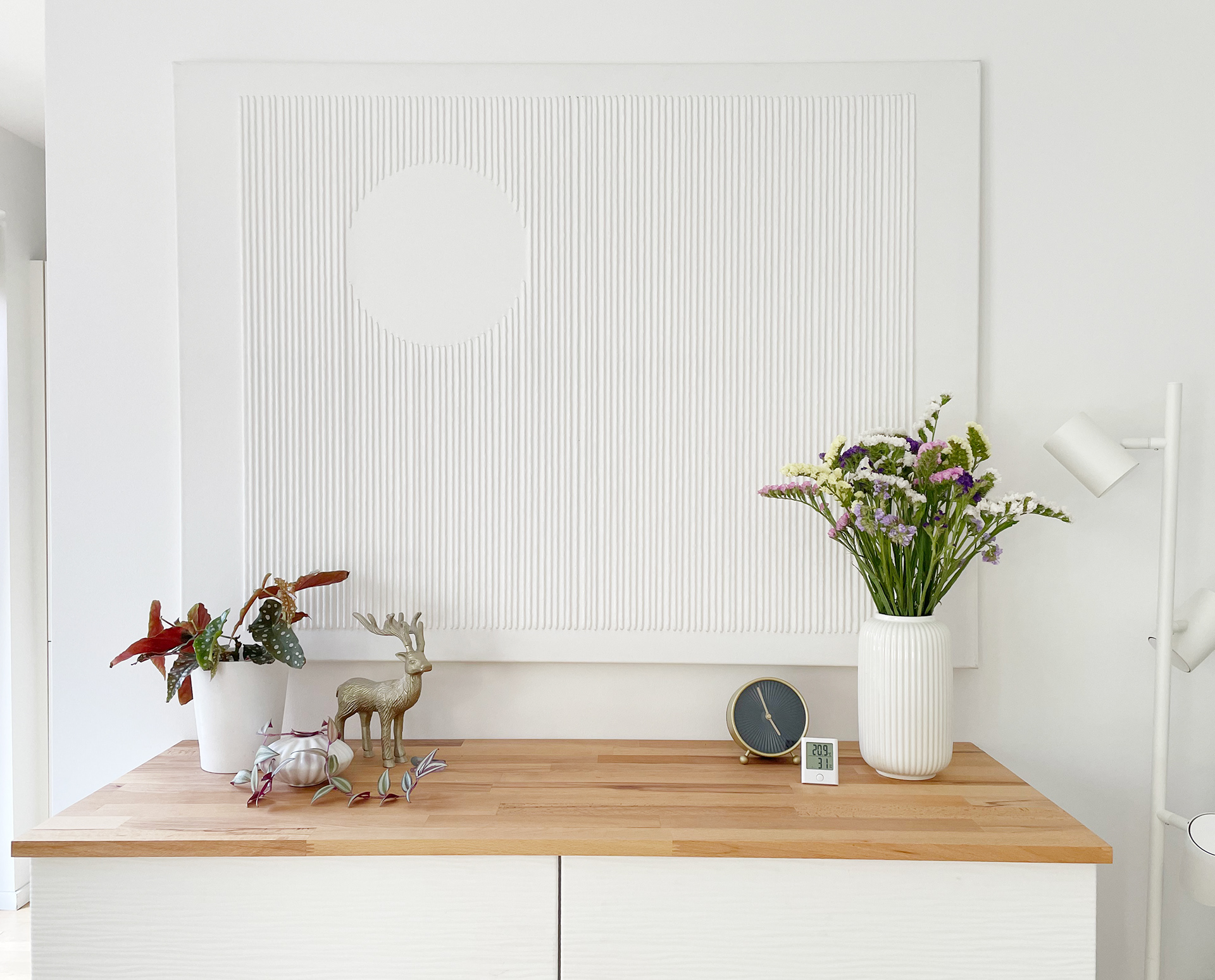 A series of white-on-white artworks using mixed media on plain canvases. The pieces incorporate material textures and shapes to create whimsical gradients of white.